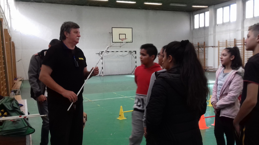 Közlekedés fehér bottal. Tóth Sándor a tanulók körében